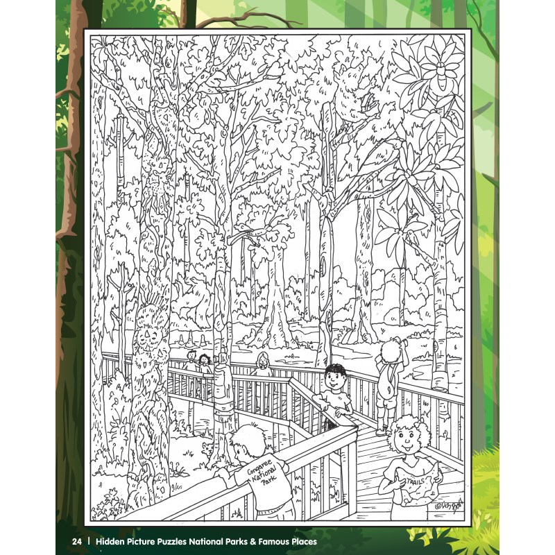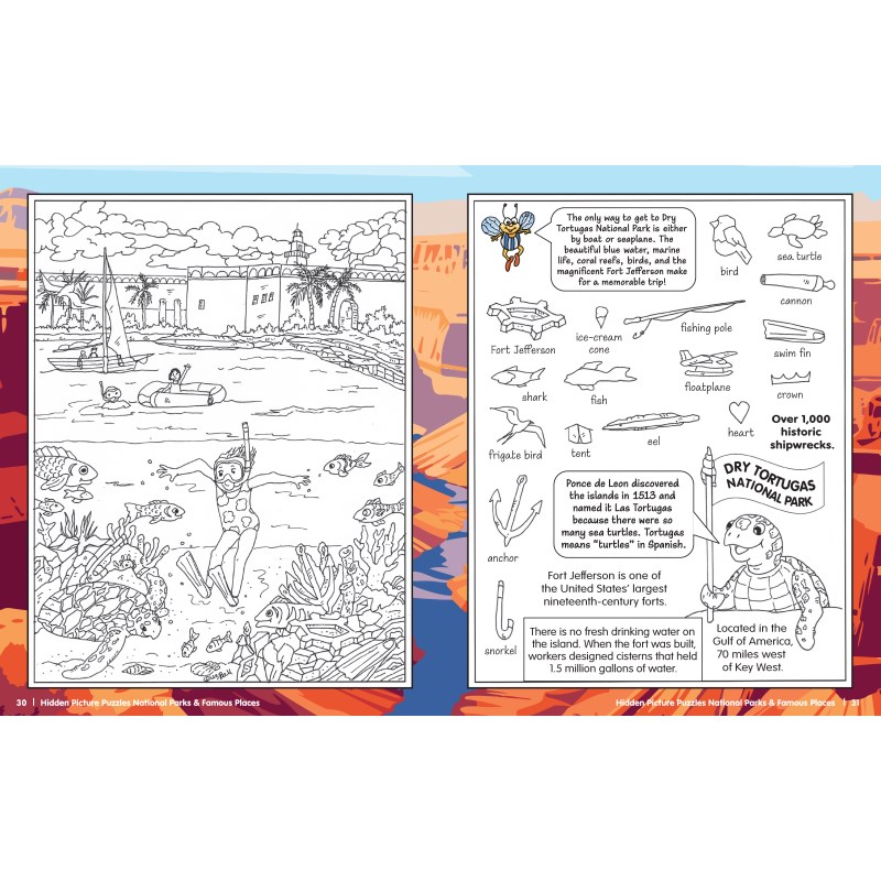 This engaging activity book is filled with 50 black and white hidden puzzle pictures, all from famous road trip places.With hundreds of secret items and landmarks to find within each illustration, you’ll be on the prowl for hours! Search for grizzly bears, prairie dogs, ancient arrowheads, log cabins, and so much more! Learn while you play by reading the mini fun facts in the margins that are all about famous places. These black and white pages double as coloring activities, so go wild! Answer keys in the back. Are you ready to seek, find and color? Let the journey begin! Soft cover, 96 pages, 10 x 8 inch (25.4 x 20.3 cm).