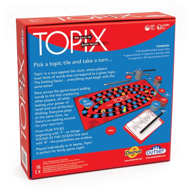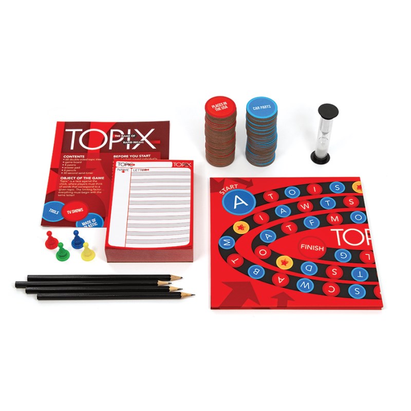 Make your way across the game board adding words to the lists created by other players, all while testing your power of recall and out-of-the-box thinking. Everyone plays at the same time, so there’s no waiting around for your next turn. From FILM TITLES beginning with “T” – to things FOUND IN THE OCEAN that start with “B’ – the possibilities are endless. Played individually or in teams, Topix is perfect for family game night. Includes 68 double-sided topic tiles, game board, 4 pawns, answer pad, 4 pencils, 30 second sand timer, rules. 2+ players.