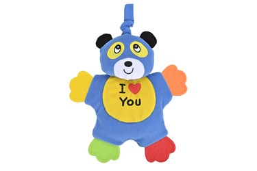 Soft plush activity toy for baby for multi-sensory on-the-go fun! Squeeze belly for squeaker sound. Includes textured teether hands & feet in 4 different colors. Encourages frequent vocal and visual reminders to baby that they are loved! 7.5” x 7” x 1.4” (19 x 17.8 x 3.6cm).