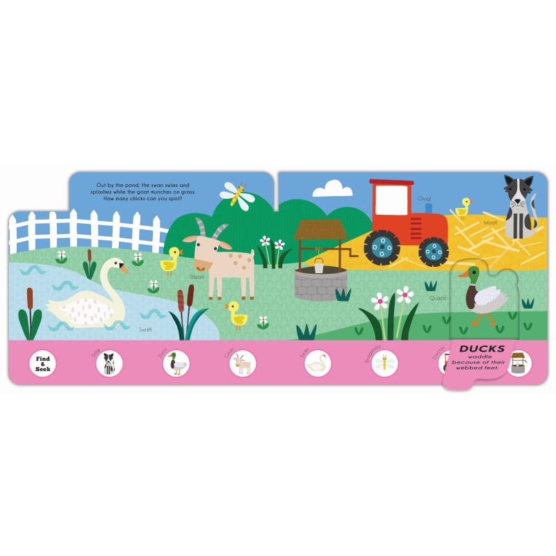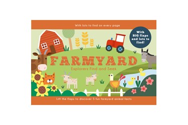 A charming interactive seek-and-find book for young curious minds. Each page is packed with colorful illustrations of farmyard animals and objects to seek and find and fun animal facts to discover under each easy-to-lift flap. All 10 pages are beautifully illustrated with fun colors and graphics, and each item is labeled for kids to easily learn the names of all 35 animals and objects. Young readers are tasked to seek and find things like a rooster, donkey, rabbit, scarecrow, tractor and more! Nice sensory feel with embossed front & back covers and tabbed page design. Board book, 10 pages, 9.7 x 7.8 inch (24.6 x 48.3 cm).