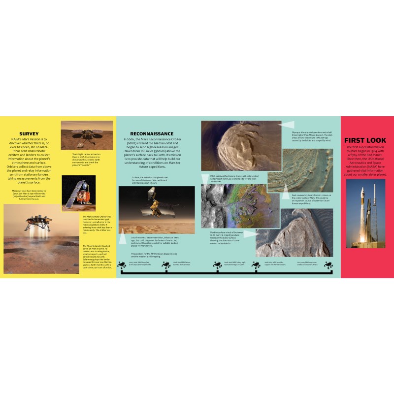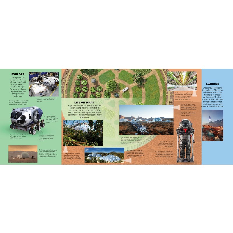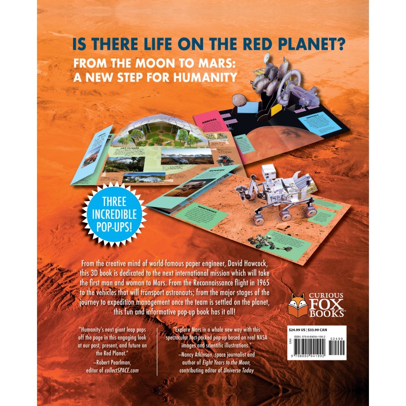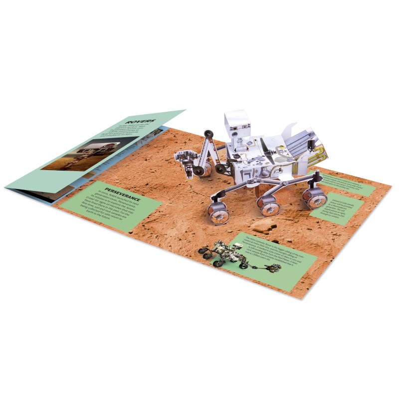 The Mission to Mars pop-up book illustrates the technology necessary to achieve this ambitious mission, analyzing the environmental and atmospheric conditions astronauts will encounter, and whether the planet can sustain human life, with 3 amazing multi-dimensional pop-ups: Mars Perseverance Rover, the Nautilus X Spacecraft, and the Mars Biodome. Each 2-page spread includes a fold-out with extended reading and photographs further detailing each phase of the mission's preparation. Topics covered in the book include the 2006 Mars Reconnaissance Orbiter mission, NASA's 2020 launch of the Perseverance Rover and its mission, preparations for Mars, artificial gravity, Nautilus-X, and life on Mars. This information-rich book will engage and educate young space enthusiasts with striking photographs, lots of interesting and unusual facts, and in-depth insight into the work being done in preparation for the Mission to Mars. Hard cover, 14 pages, 9.75 x 12 inch (24.8 x 30.5 cm).