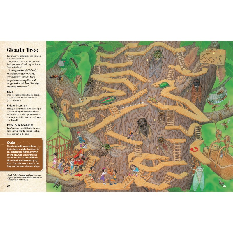 Part of the best-selling "Learn & Play" maze picture book series by Japanese author and illustrator Gentaro Kagawa. The 12 highly detailed, beautifully illustrated, and visually accurate maze designs are filled with quizzes, riddles, and hidden objects to solve the quest. While walking their dogs, a child happens upon a mysterious place with a secret door where insects are gathering. When a magic stone is pushed, the door opens, and a samurai appears. Frightened, the dogs run into the hole followed by the child, and they shrink in size and enter a mystical world of insects. Each maze provides a new challenge, clues, and facts about the insects they will encounter in each new setting. To solve the quest and exit from the mysterious insect hole, the child must find the dogs by solving a series of different challenges.Clues are offered to help solve each maze, as well as an answer key.