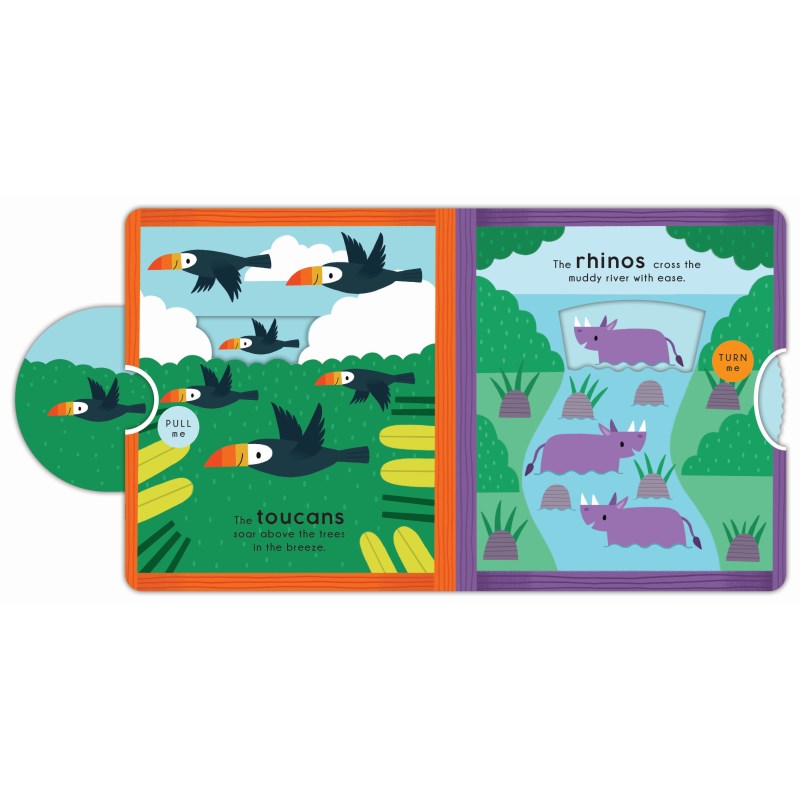 Young readers can travel into the wild and discover 10 animals in their natural habitats from the comfort of their homes. Each page has adorable illustrations of animals like zebras, parrots, elephants, tigers, and more, each with an interactive playful slider to see them in motion! Not only will kids interact with the animals, but they’ll also read a rhyme for each one. Perfect for curious minds and little hands! Board book, 10 pages, 8.9 x 7.7 inch (22.6 x 19.6 cm).