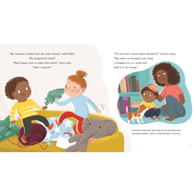 Nikki and Enzo are playing a game about accidents . . . LOTS of accidents. When Nikki’s dinosaur crashes into the train station and bumps his head, Enzo’s mom, who’s a doctor, introduces the two children to some simple first aid, like wrapping ice in a cloth and holding it to the bump. As the game continues, more casualties are discovered (or averted) thanks to Mom’s practical advice on things like nosebleeds, allergies, sick stomachs, water safety, and how to get help quickly in an emergency. With a running narrative, useful tips scattered throughout, and friendly illustrations, this charming story will keep young children engaged and serve as a valuable teaching tool for parents and teachers. Hard cover, 32 pages, 10.9 x 10 inch (27.7 x 25.4 cm).