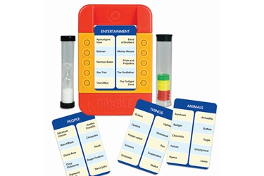 With over 100 lists in 7 categories (People, Places, Things, Activities, Entertainment, Animals, Games) to play, it’s crammed with entertainment. Have you got the “Gift of the Gabble”? Frantic fast-talking fun for all! Keep score with the nifty built-in button poppers. And everything stores conveniently inside the card dispenser for on-the-go stimulation. For 2 teams. Includes card dispenser, 55 double-sided cards, sand timer, scoring tokens, storage vial, and rules.